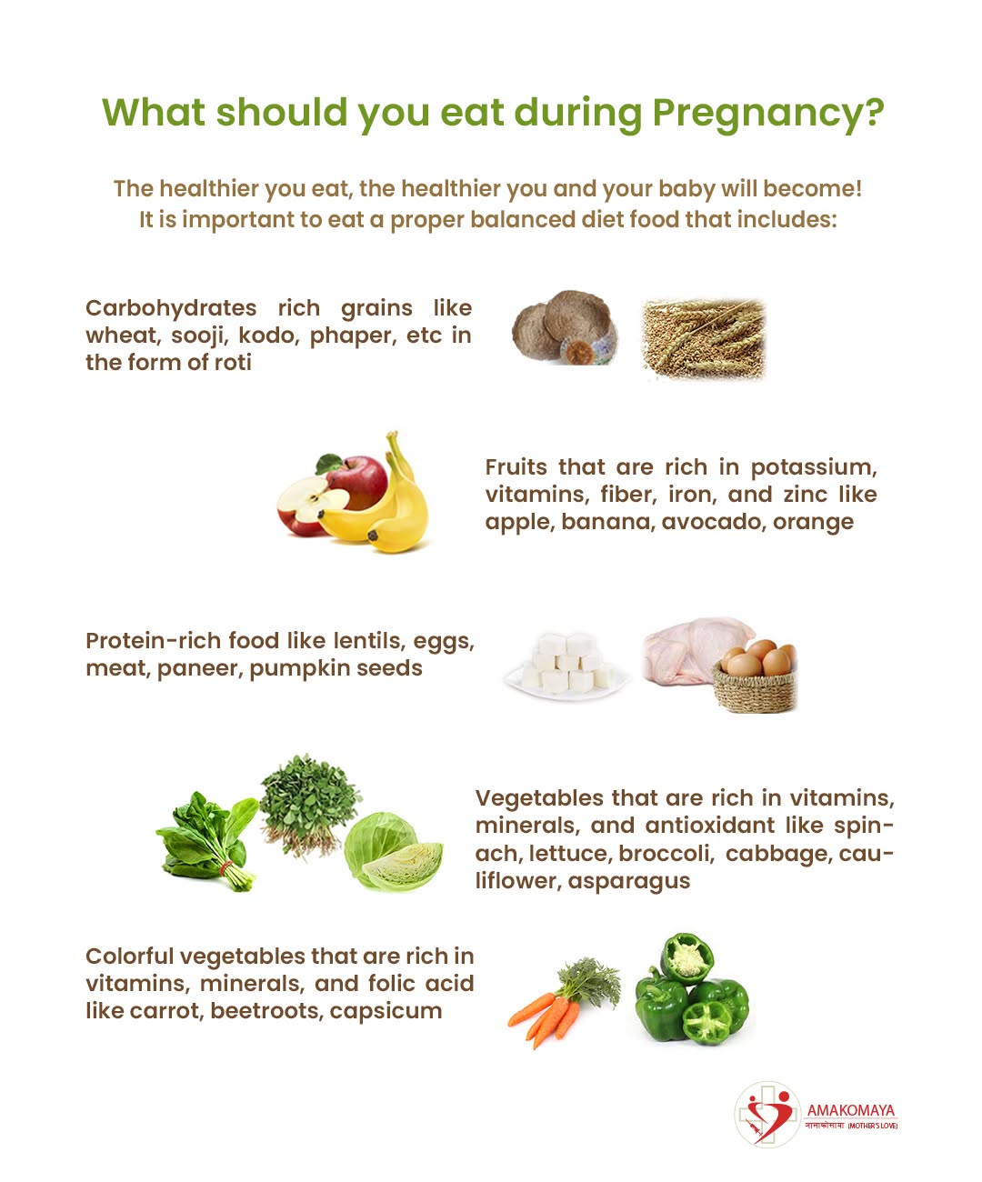 गर्भावस्थामा सन्तुलित आहार निकै महत्वपूर्ण हुन्छ । पोटेशियम, भिटामिन, फाइबर प्रशस्त मात्रामा पाइने फलफूल जस्तै स्याउ, केरा, एवाकाडो, सुन्तला, प्रोटीनयुक्त दाल, अण्डा, मासु, पनीर, भिटामिन र मिनिरल्सयुक्त साग , गाँजर, ब्रोकली, बन्दागोबी र कार्बोहाइड्रेटयुक्त अन्न जस्तै गहुँ, सूजी, कोदो , फापर, आदिको सहि मात्रामा सेवन गर्नु बच्चा र आमाको स्वस्थको लागि फल्दाही हुन्छ।